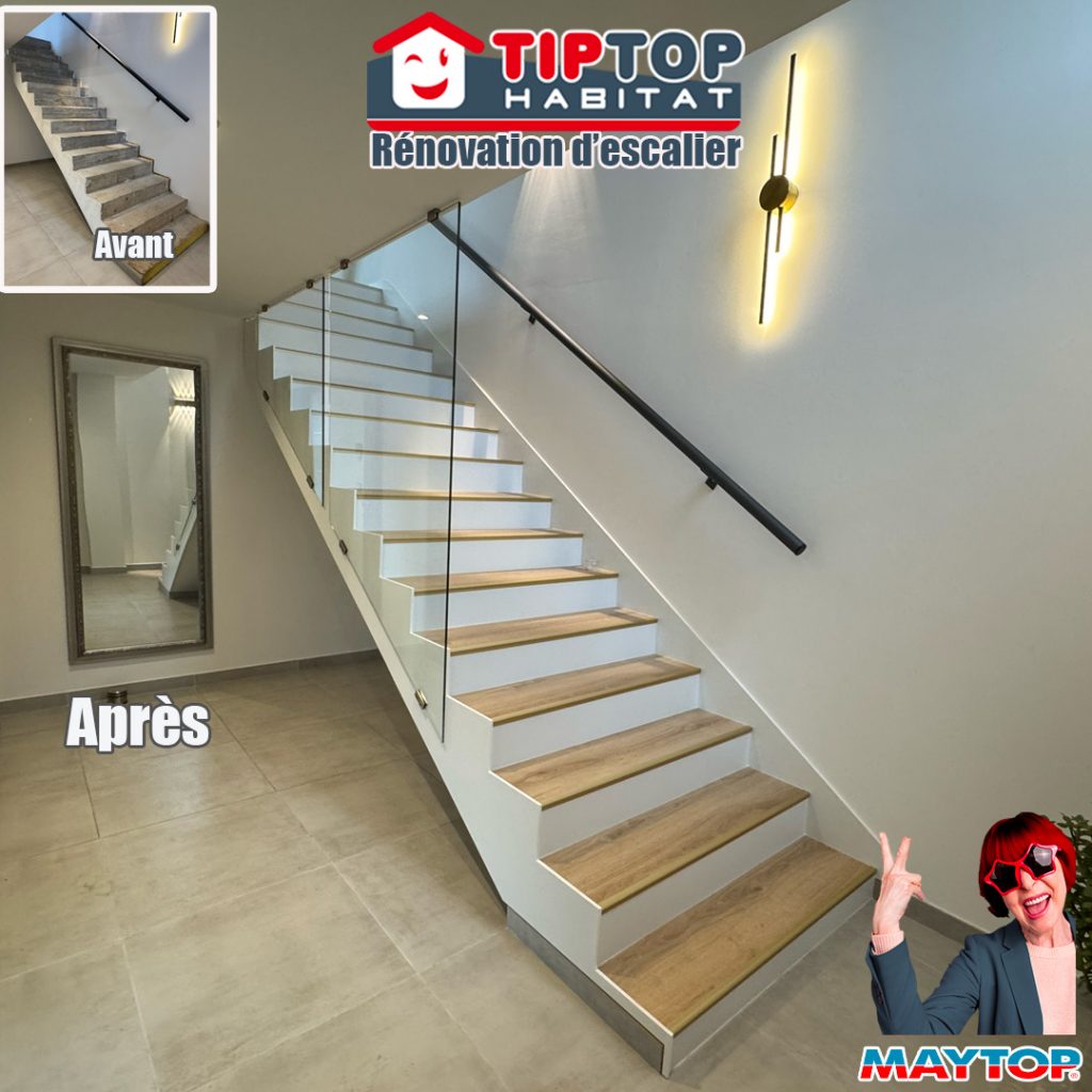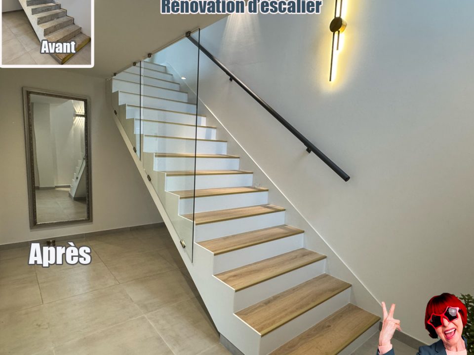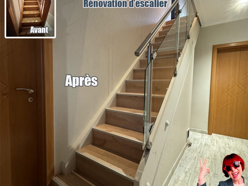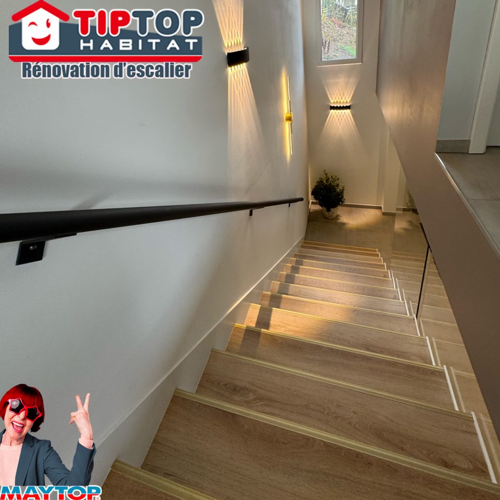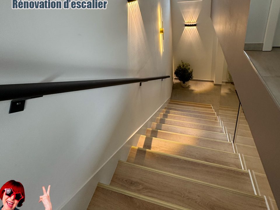 Coupe de la rampe pour un rendu plus léger, pose d'une rampe en inox. Recouvrement stratifié des marches avec nez de marche aluminium. 📐 Pose sur mesure #menuiserie #escalier #habillageescalier #stratifié #artisan #hautrhin .- Date